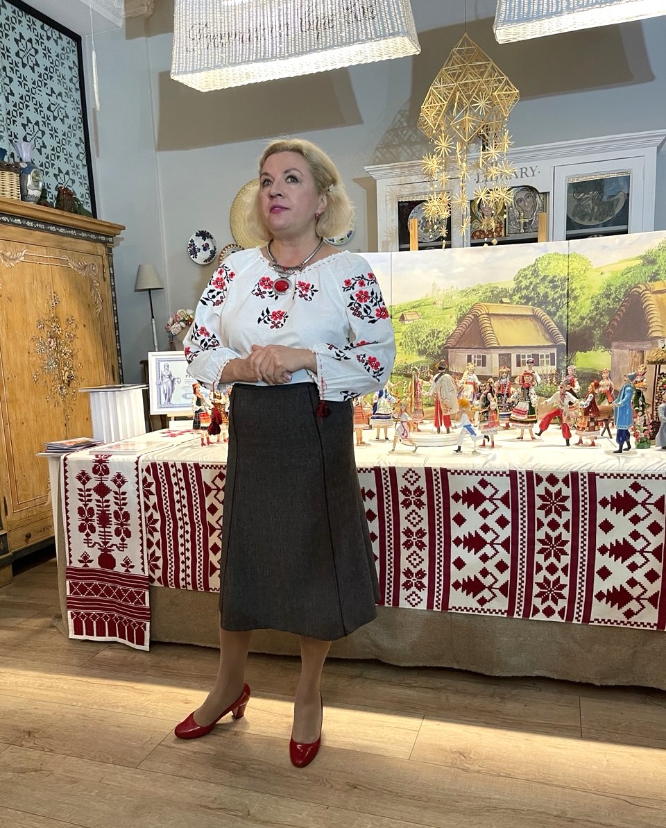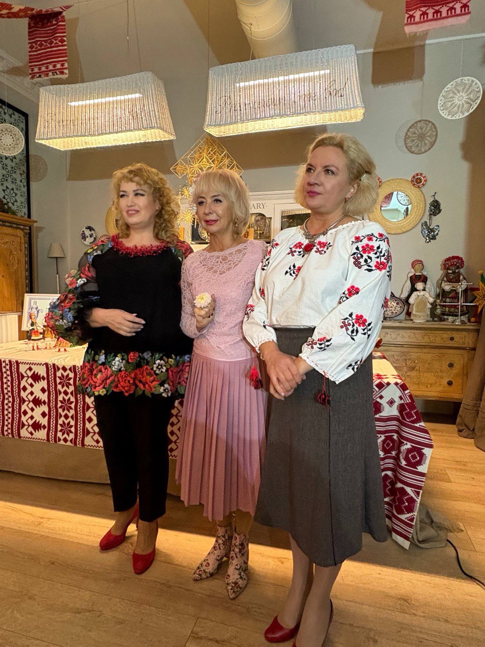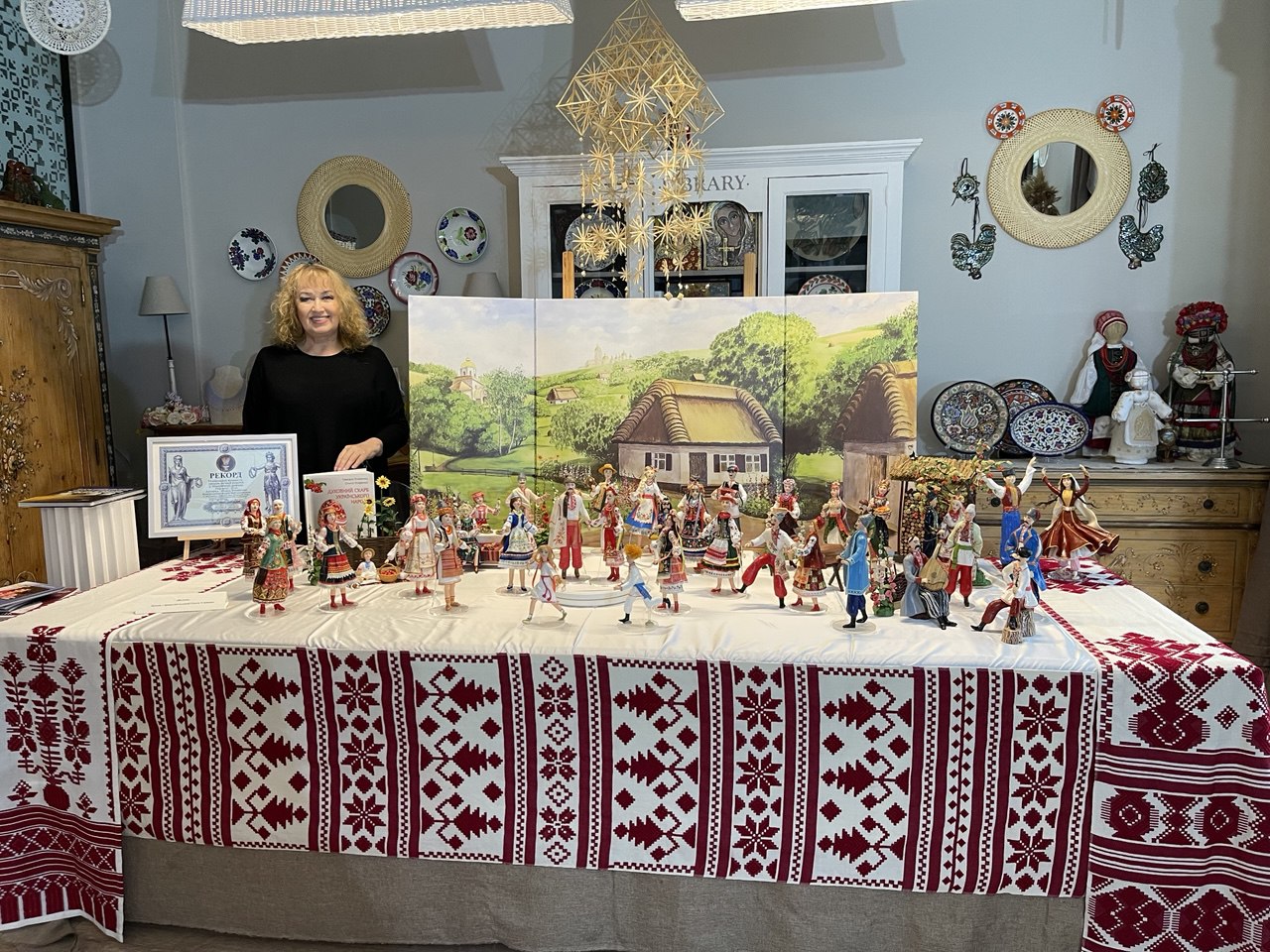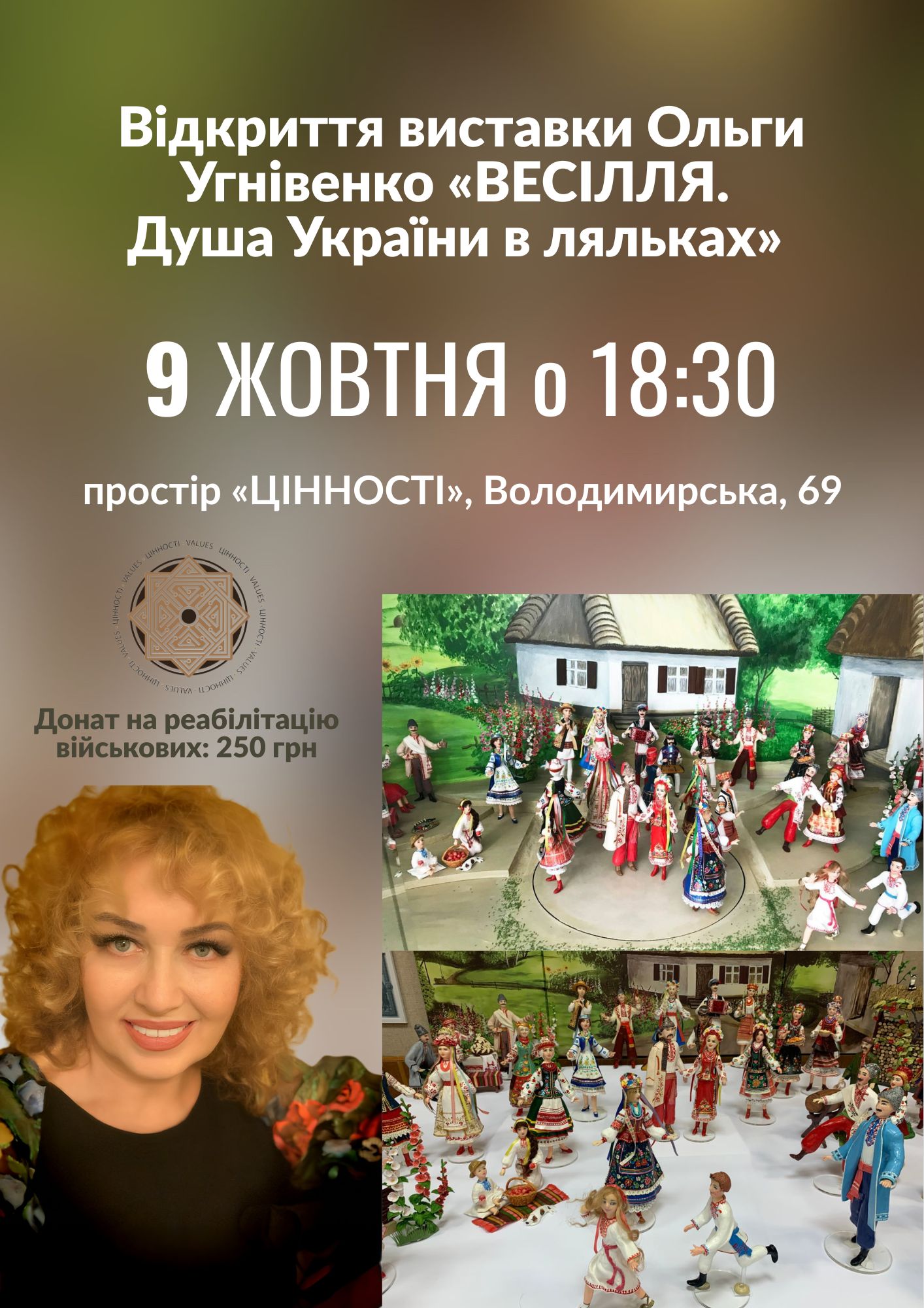 ” У культурно-просвітницькому просторі «Цінності» відкрилась виставка Ольги Угнівенко «ВЕСІЛЛЯ. Душа України в ляльках». Талановита Народна майстриня України, лауреатка Національної премії «Скарб нації – 2022», співачка, художниця, авторка пісень представила доробок своєї унікальної творчості. Заслужена артистка України Тетяна Школьна і народна артистка України Світлана Мирвода проілюстрували колекцію ляльок весільними піснями.”
